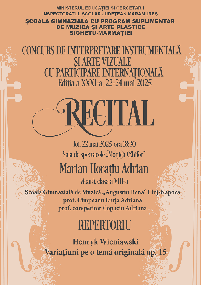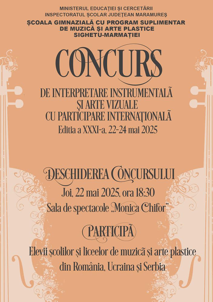 Concursul de Interpretare Instrumentală și Arte Vizuale cu participare internațională, ediția a XXXI-a, 22-24 mai 2025 se încheie cu Gala Laureaților care are loc sâmbătă, 24 mai 2025, ora 10, în sala „Monica Chifor” (Școala cu Program Suplimentar de Muzică și Arte Plastice, Sighetu-Marmației).